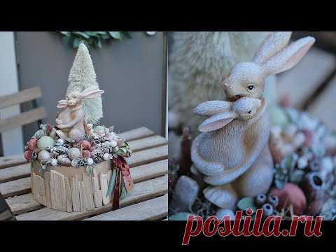 На изображении декоративная композиция с изображением зайца и зайчонка. Композиция украшена искусственными ягодами и маленькой елочкой. Все элементы собраны на круглой деревянной основе.