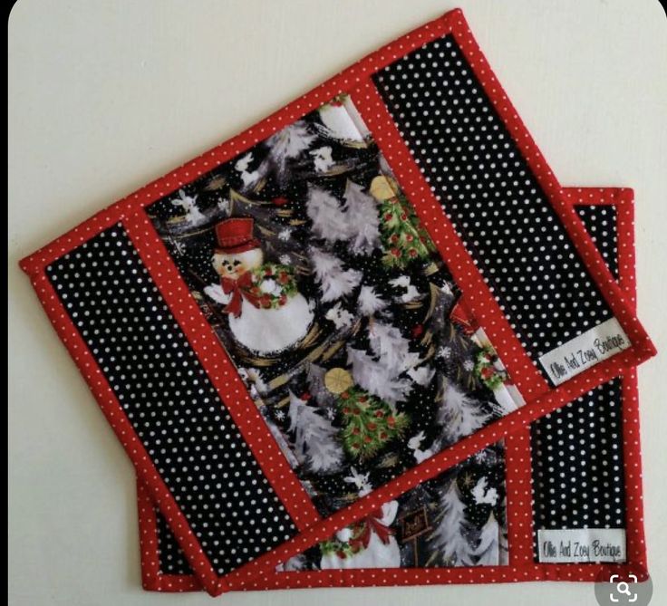 На изображении представлены две подставки с новогодним дизайном. Они украшены изображением снеговика и рождественскими мотивами на черном фоне с белыми точками и красной каймой.