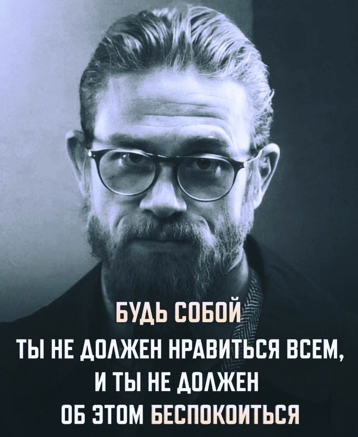 На изображении мужчина в очках, под ним текст: "БУДЬ СОБОЙ. ТЫ НЕ ДОЛЖЕН НРАВИТЬСЯ ВСЕМ, И ТЫ НЕ ДОЛЖЕН ОБ ЭТОМ БЕСПОКОИТЬСЯ".