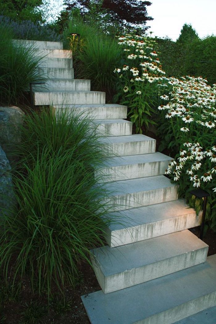 Каменная лестница, окруженная зеленью и белыми цветами.