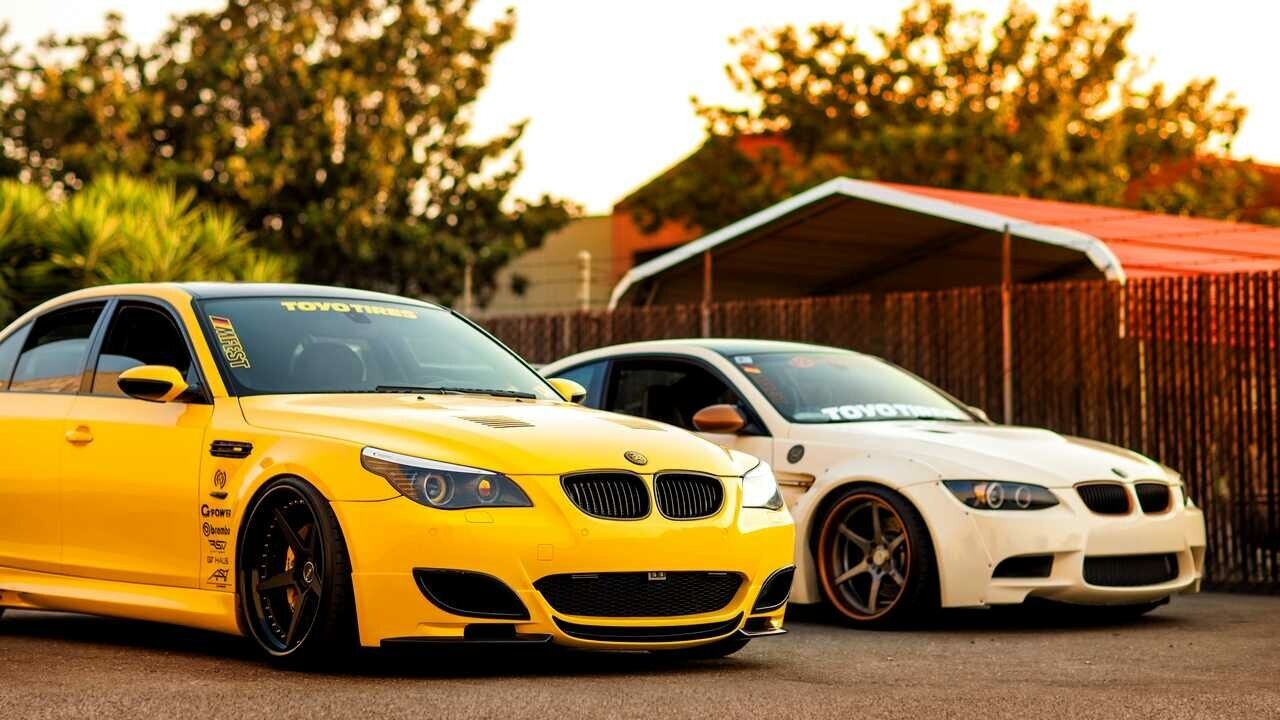 На изображении два спортивных автомобиля BMW, желтый и белый, припаркованные на улице. Вокруг них деревья и забор.