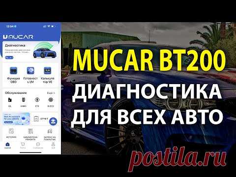Изображение содержит рекламу устройства MUCAR BT200, предназначенного для автомобильной диагностики. На фото слева изображен интерфейс приложения, а справа - автомобиль.