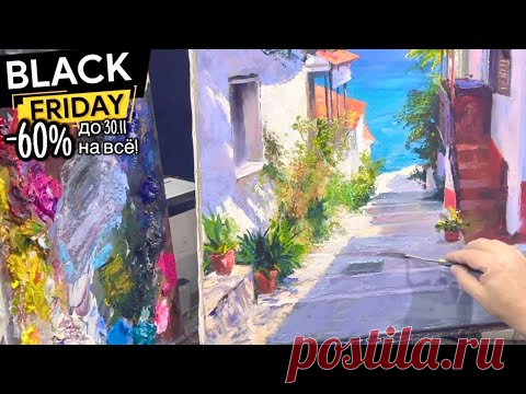 Изображение демонстрирует процесс создания картины, на которой изображена живописная улочка с цветами и видом на море. В левой части изображения виден холст с палитрой красок. Рядом находится реклама с надписью "Black Friday" и скидкой -60%.