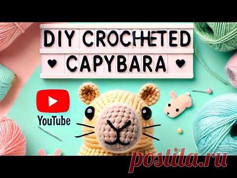Изображение с мастер-классом по вязанию крючком капибары. На фоне представлены клубки пряжи и надпись на английском языке: DIY CROCHETED CAPYBARA. Видно логотип YouTube.