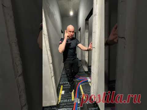 Мужчина стоит в узком коридоре в процессе стройки или ремонта. На полу видны разноцветные трубы.