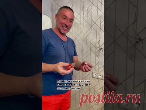 На изображении мужчина с отверткой что-то чинит у розетки, он выглядит веселым и радостным. Текст на изображении гласит: "Муж практически стал самостоятельным, всё без меня делает".