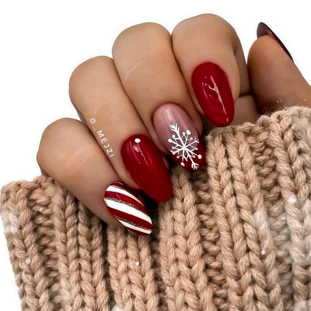Маникюр с праздничным дизайном, включающим красные ногти, рисунок снежинки и полоски на фоне вязания.