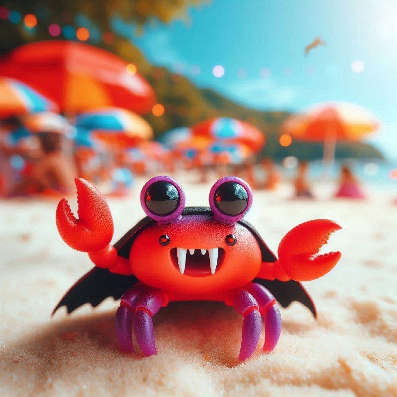Яркая игрушка в форме краба с большими глазами и клешнями на фоне пляжа с зонтиками.