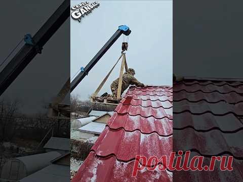 Человек работает на крыше дома, используя строительную технику.