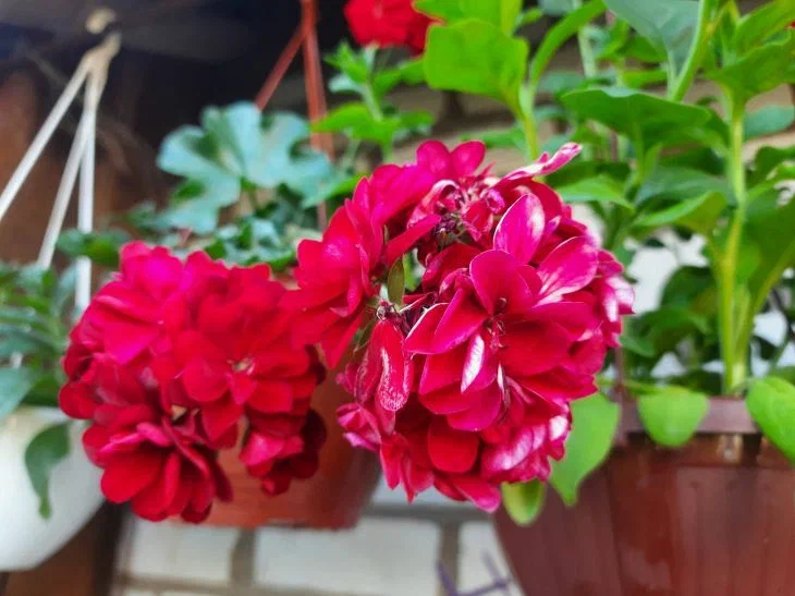 Изображение показывает красные цветы, растущие в горшках. На заднем плане видны зеленые листья.