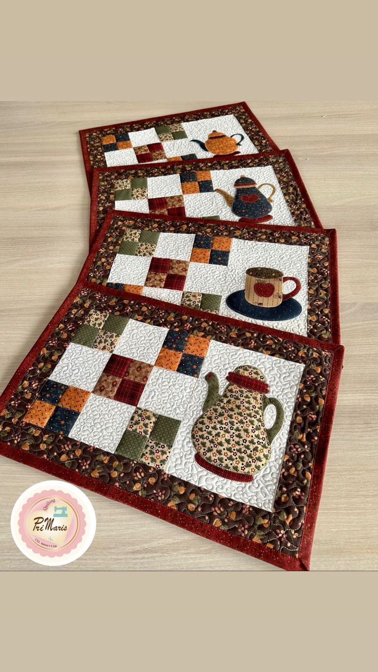 Изображение с четырьмя декоративными тканевыми подставками с узором в стиле пэчворк и аппликациями в виде чайников и чашек.