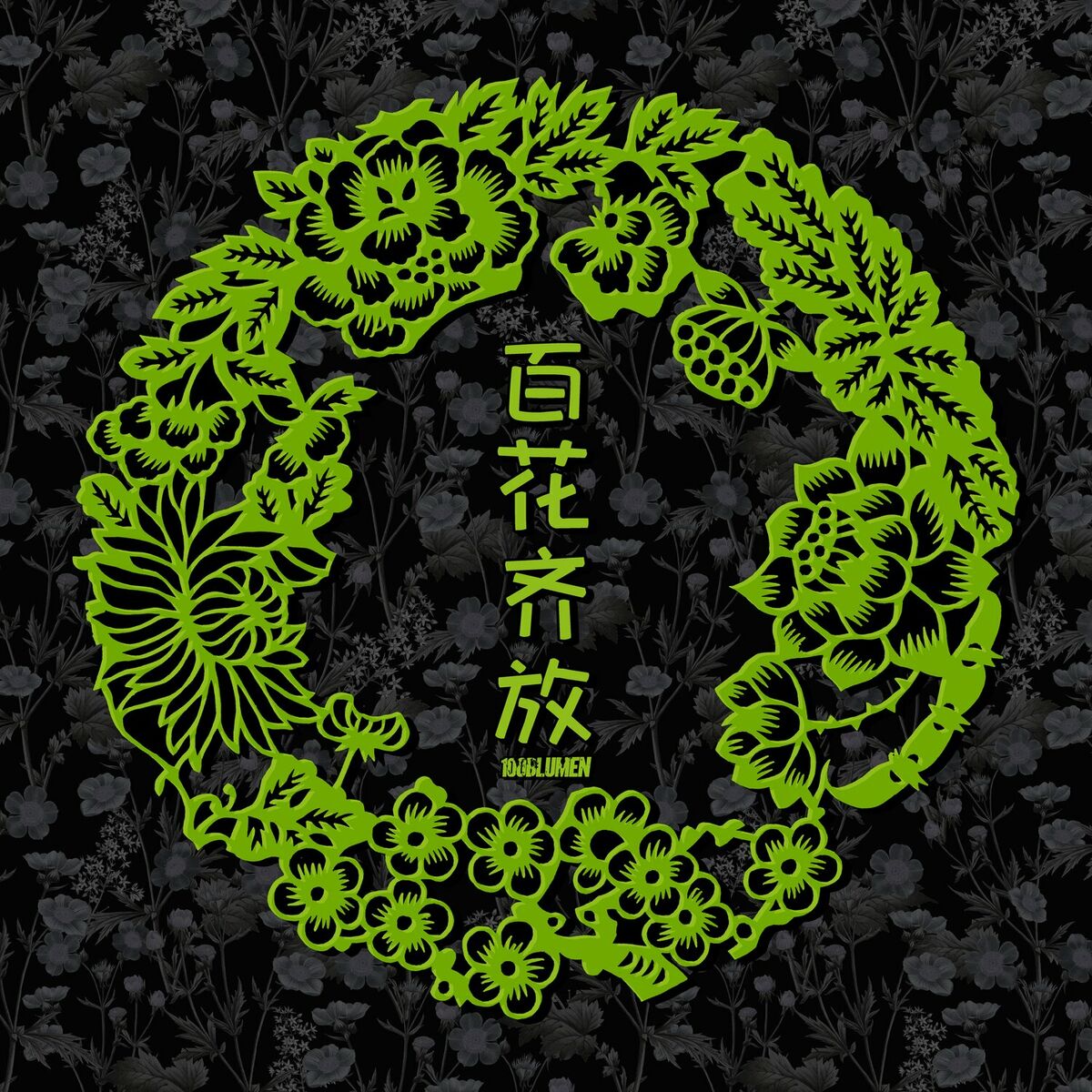 Изображение зеленого венка из цветов и листьев на черном фоне с китайскими иероглифами в центре.