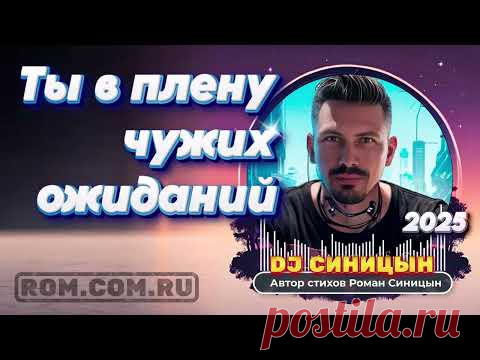 Изображение с обложкой музыкального произведения с текстом "Ты в плену чужих ожиданий". На ней показан мужчина и указано, что это работа DJ Синицына, автор стихов Роман Синицын. Также указаны год "2025" и ссылки на сайты.
