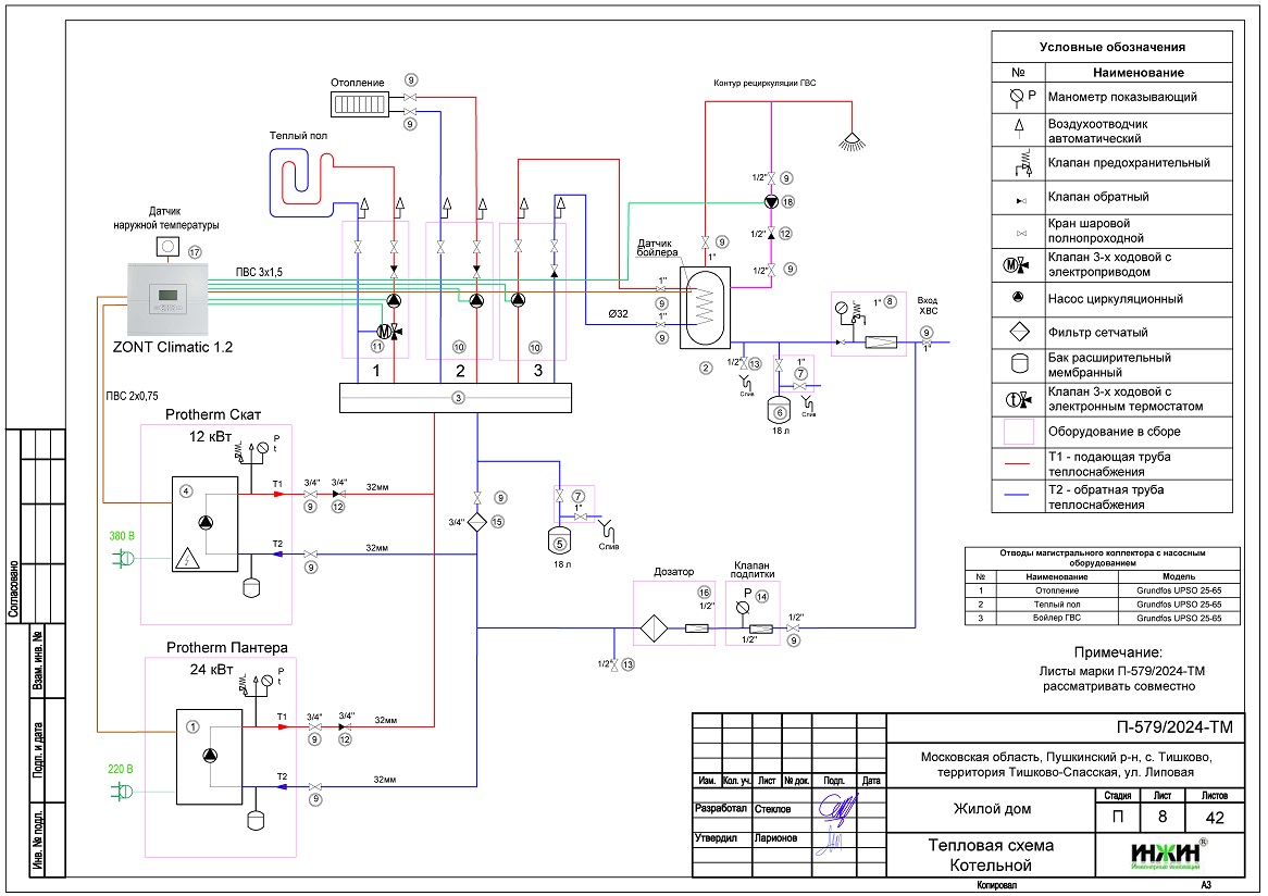 Это техническая схема управления отопительной системой, включающая компоненты для циркуляции и регулирования теплоносителя. На схеме изображены различные клапаны, насосы и элементы системы управления, отмеченные символами и сопровождаемые объяснительными надписями на русском языке.