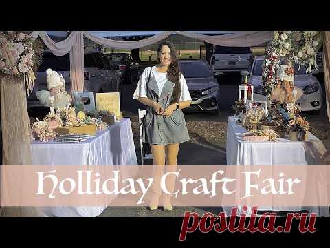Изображение показывает праздничную ярмарку, где женщина стоит между двумя столами с декоративными изделиями и подарками.