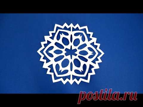 На изображении показана бумажная снежинка, вырезанная вручную, на синем фоне. Снежинка имеет сложный симметричный узор.
