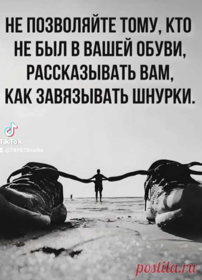 Изображение содержит текст на русском языке: "НЕ ПОЗВОЛЯЙТЕ ТОМУ, КТО НЕ БЫЛ В ВАШЕЙ ОБУВИ, РАССКАЗЫВАТЬ ВАМ, КАК ЗАВЯЗЫВАТЬ ШНУРКИ." На переднем плане изображены кроссовки, а вдали стоит человек, держащий шнурки.