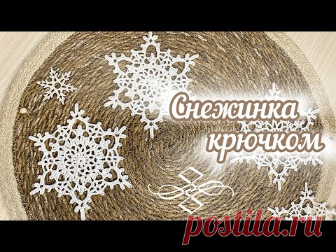 На изображении показаны вязаные крючком снежинки на круглой подставке из джута. Также присутствует текст, который гласит "Снежинка крючком".