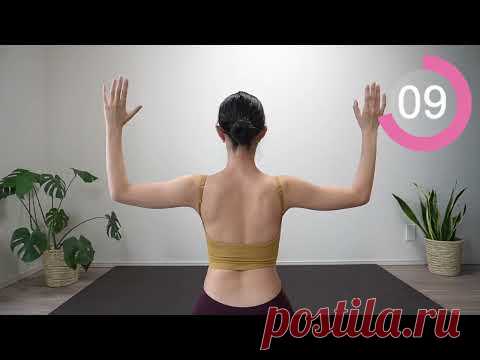 Женщина занимается йогой в комнате, подняв руки. Вокруг нее зелёные растения в горшках. Таймер показывает число 9.