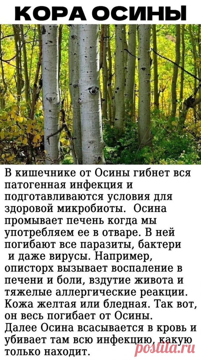 Изображение содержит текст о пользе коры осины для организма. Говорится о том, что она помогает бороться с патогенной инфекцией, очищает печень и уничтожает паразитов, бактерии и вирусы.