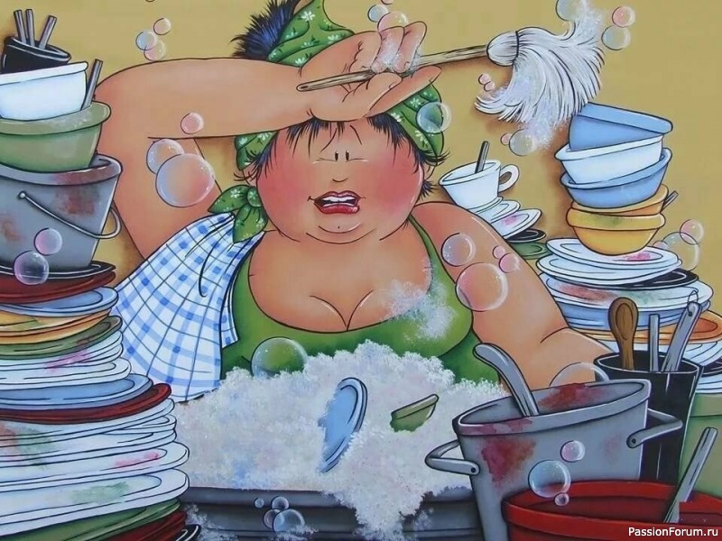 Карикатурное изображение уставшей женщины, стоящей перед большим количеством грязной посуды, с пузырьками мыла, окружающими её.
