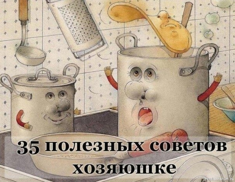 Иллюстрация с ожившими кастрюлями на кухне. У кастрюль есть лица и руки, а на переднем плане изображена надпись "35 полезных советов хозяюшке".