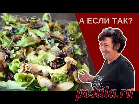 Изображение салата с листьями салата, грецкими орехами и овощами. Справа женщина в черной футболке и надпись "А ЕСЛИ ТАК?".