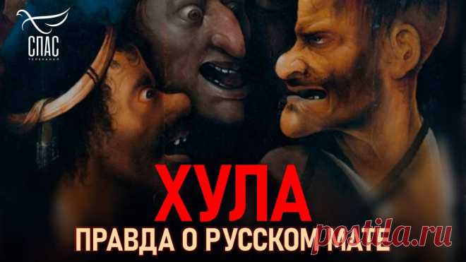 Изображение состоит из нескольких карикатурных лиц, повернутых друг к другу. В центре изображен текст: "ХУЛА ПРАВДА О РУССКОМ МАТЕ". Логотип в левом верхнем углу и надпись "Спас".