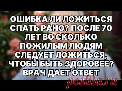 Изображение с текстом: "Ошибка ли ложиться спать рано? После 70 лет во сколько пожилым людям следует ложиться, чтобы быть здоровее? Врач дает ответ." Текст расположен на фоне размытых цветов.