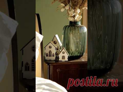 На изображении тумбочка с декоративными домиками и большой вазой с сухоцветами.