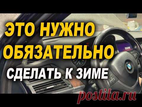 Изображение показывает интерьер автомобиля BMW с текстом, рекомендующим подготовку автомобиля к зиме.