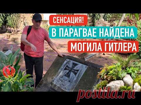 Изображение показывает человека возле надгробия, окруженного растительностью. Сообщение на изображении утверждает, что в Парагвае найдена могила Гитлера. Надпись на надгробии содержит изображение железного креста.
