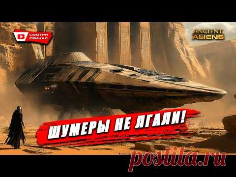 Изображение показывает футуристический космический корабль в пустынной местности с человеком в черном плаще на переднем плане. На переднем плане текст на русском языке: "Шумеры не лгали!".