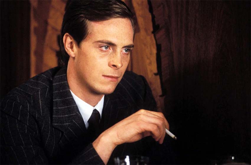 На изображении мужчина в костюме и галстуке, держащий сигарету. Он сидит в помещении с деревянными стенами.