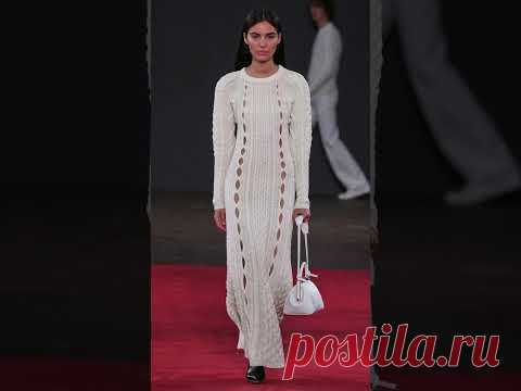 Модель идет по подиуму в вязаном платье с длинными рукавами и белой сумкой.
