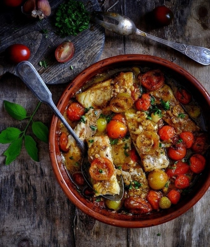 Треска с томатами, чесноком и песто Ингредиенты:Филе трески — 400 гЧеснок — 1–2 зубчикаПомидоры черри — 1 горстьПесто — 1 ст. л.Белое вино — 250 млОливковое масло — опциональноСоль — по вкусуПерец — по вкусуСахар — по вкусуПриготовление:1. Зубчик чеснока мелко порезать и...