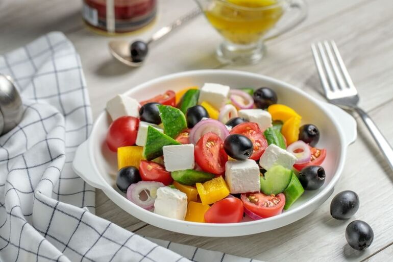 Изображение греческого салата с кусочками феты, помидорами, огурцами, перцем, луком и оливками на белой тарелке.
