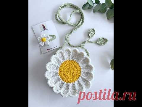 Вязаная сумка в форме ромашки с желтым центром и зелёным ремешком.