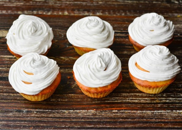 Сливочные капкейки Ингредиенты:Яйцо куриное — 2 шт.Масло сливочное — 50 г Молоко — 0,5 стак. Соль — 1 щепотка Сахар — 4 ст. л. Сахар для взбивания белков — 1 ст. л. Разрыхлитель — 0,5 ст. л.