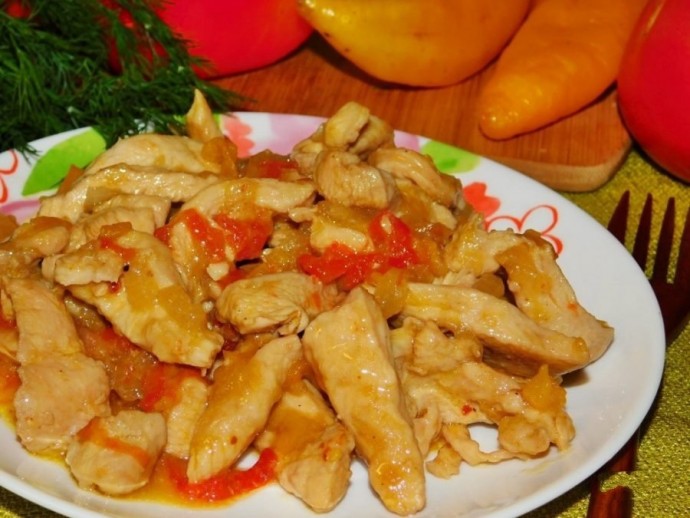 Курица в апельсиновом соке Ингредиенты: Куриное филе — 400 гСоевый соус — 100 мл Лук репчатый — 2 шт. Болгарский перец — 2 шт.Апельсин — 1 шт. Специи — по вкусуПриготовление:1. Куриное филе нарежьте на тонкие полосочки и замаринуйте в соевом соусе на пару...