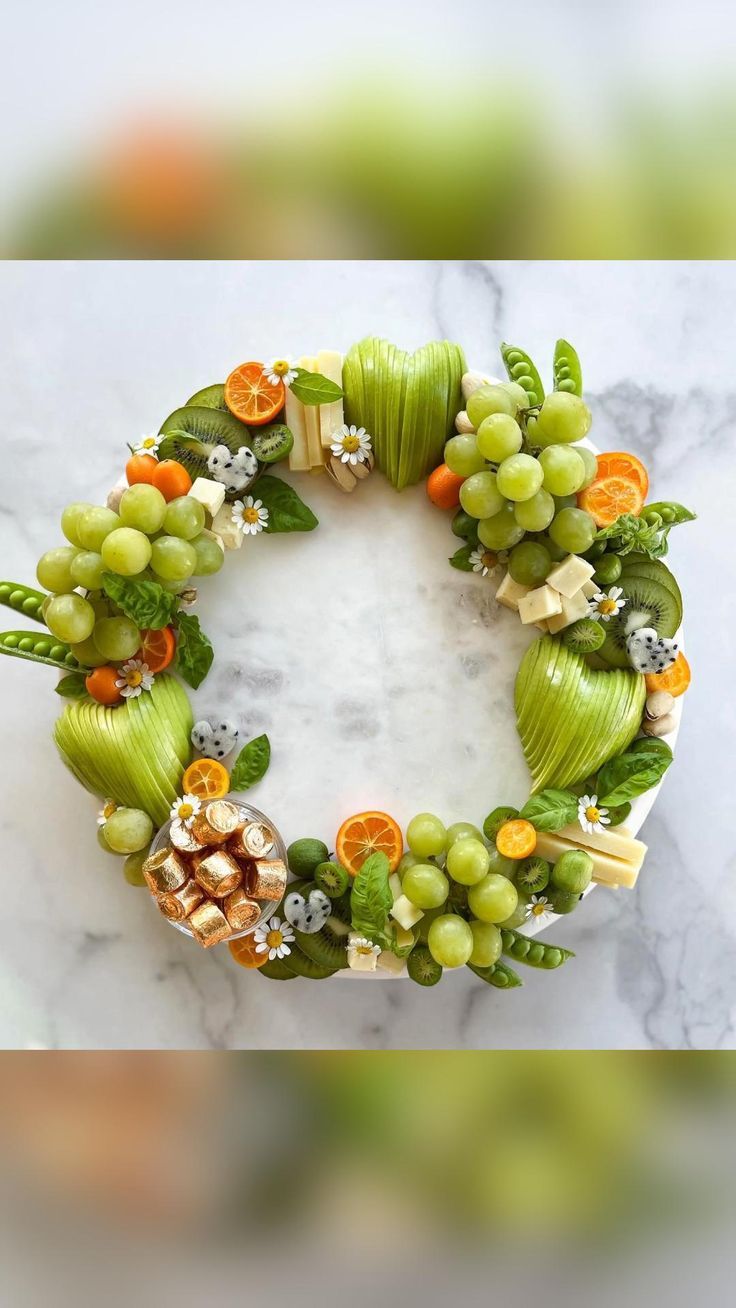 На изображении фруктовая композиция в виде венка. Венок украшен виноградом, киви, лаймом, ломтиками сыра и разнообразной зеленью. Также присутствуют декоративные элементы, такие как цветы и конфеты в золотистой упаковке.