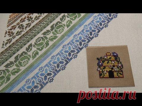 На изображении показана схема для вышивки крестом с яркими цветочными узорами и отдельный сэмпл в виде дома с растениями.