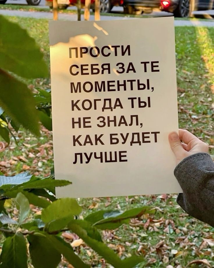 На изображении человек держит лист бумаги с надписью: "Прости себя за те моменты, когда ты не знал, как будет лучше". На заднем плане зелёная трава и автомобили.