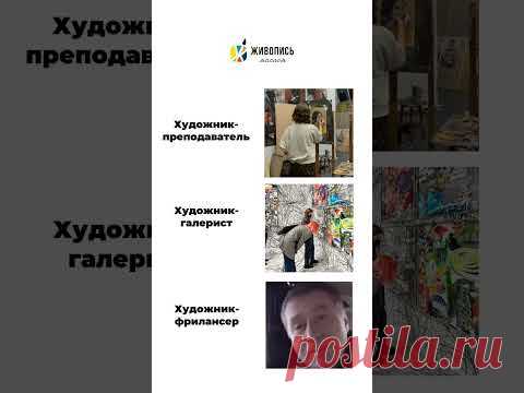 Изображение содержит три фотографии с подписями: "Художник-преподаватель" показывает человека на фоне картин, "Художник-галерист" с человеком, просматривающим картины, и "Художник-фрилансер", где изображен портрет мужчины.
