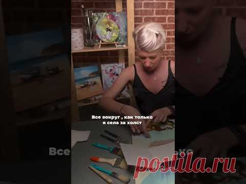 Человек сидит за столом и занимается рукоделием или рисованием. На заднем плане видно несколько картин и предметов искусства. На столе лежат кисти и блокнот. Стена за человеком кирпичная.