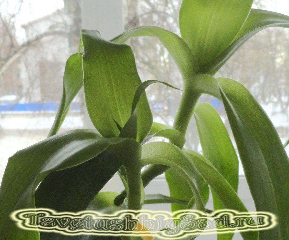 Комнатное растение с длинными зелеными листьями на фоне окна.