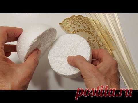 Изображение показывает руки, держащие два полукруга из пенопласта. Также видны золотые полоски ткани или ленты и тонкие деревянные палочки.