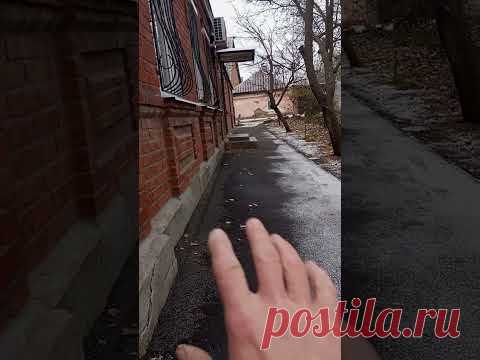 Изображение показывает руку человека, вытянутую вперед, на фоне дорожки рядом с кирпичным зданием. Вокруг находится зимний пейзаж с деревьями.