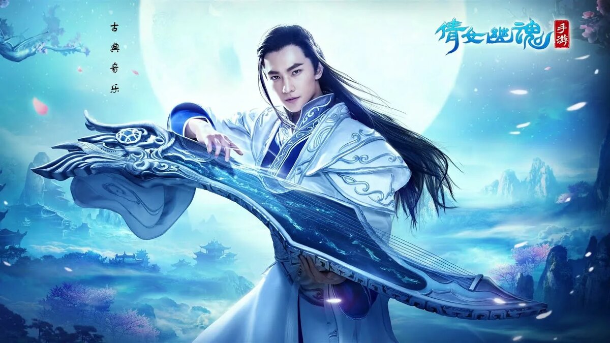 Человек в традиционной азиатской одежде с длинными волосами держит музыкальный инструмент на фоне фантастического пейзажа и полной луны.