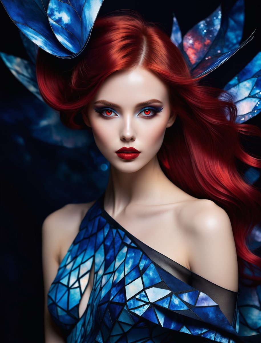 На изображении изображена женщина с ярко-красными волосами и эффектным макияжем, она одета в платье синего цвета с узором, похожим на витраж.